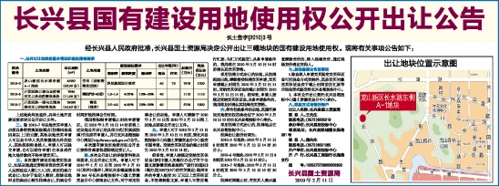 经长兴县人民政府批准,长兴县国土资源局决定公开出让三幅地块的国有建设用地使用权。现将有关事项公告如下: