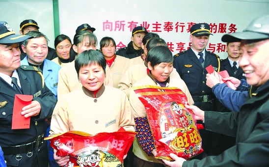 2月10日,杭州莲花社区秋水苑30多位保安以及保洁人员,收到了来自业主委员会的新年大红包。为了能让秋水苑居民过年方便,这些来自河南、江西等地的物管员工放弃回家。社区业主们从业委会基金里拿出钱给他们派红包、发礼品,还为他们准备了年夜饭、晚会等。 记者 梁臻 摄
