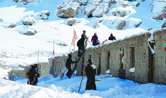 | 受西部低气压槽前暖湿气流影响,自2月8日起袭击西藏阿里、日喀则地区南部的强降雪天气造成较厚的积雪,部分道路中断。据介绍,截止到9日14时,阿里南部普兰积雪深度达23厘米。图为2月10日,阿里地区普兰县城附近村民在扫雪。新华社发 |
