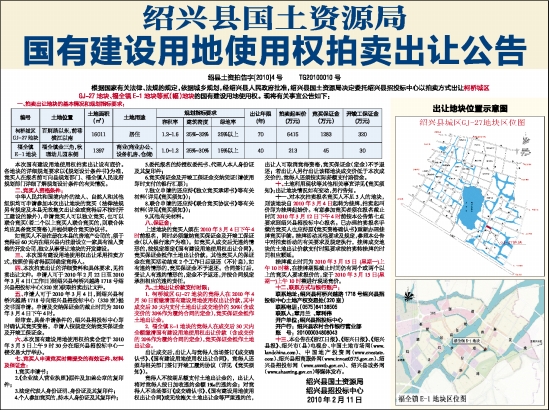 六、本次国有建设用地使用权拍卖会定于2010年3月5日上午9时30分在绍兴县招投标中心一楼交易大厅举办。