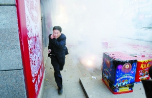 | 爆竹声声,行人受惊。 本栏摄影:记者 钟昊 |