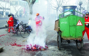 可辛苦的是环卫工人。记者在庆春路28号遇到下城区建北环卫所工人王小月时,她正在清扫银行门前满地的纸屑。她说:“他们把10多个烟花筒放完后,却把满地的纸屑扫到大街上。”不远处,正在建设银行营业点门口清理垃圾的小营环卫所工人朱红艳也在抓紧清扫。