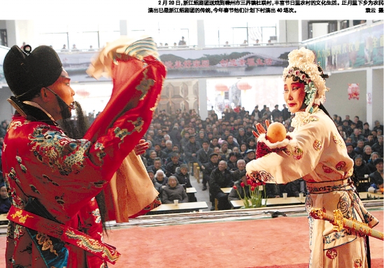 2月20日,浙江绍剧团送戏到嵊州市三界镇杜联村,丰富节日里农村的文化生活。正月里下乡为农民演出已是浙江绍剧团的传统,今年春节他们计划下村演出40场次。 袁云 摄