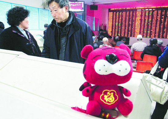 2月22日,虎年行情第一个交易日。截至收盘,沪指收于3003.4点,下跌14.73点,跌幅0.49%。杭州体育场路上一家证券交易所内,操作台上的这只小福虎没有给当天的股市带来多少运气。 本报记者 吴煌 摄