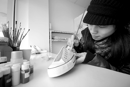 | 刘晓鑫2005年毕业于陕西科技大学艺术设计专业,享受2年免租金进驻杭州市赛博创业工场的政府鼓励政策,注册成立田间西米工艺品有限公司,平均每月能卖出2000双手绘帆布鞋。图为刘晓鑫将自己设计的图案手绘到帆布鞋上。 据新华社 |