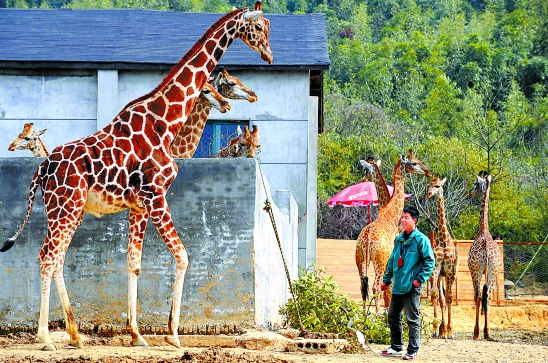 2月22日,杭州野生动物世界,14头刚从南非运来的长颈鹿第一次走出园舍,呼吸新鲜空气。 记者 梁臻 摄