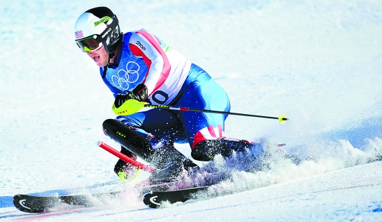 2月21日,美国名将博·米勒在温哥华冬奥会高山滑雪男子超级两项全能比赛中,以2分44秒92的总成绩夺得金牌。这是美国选手博·米勒在比赛中。