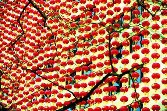 昨日,杭州体育场路上一幢大楼悬挂起近两千只小灯笼,为即将到来的元宵节营造出浓浓的喜庆气氛。 记者 梁臻 摄