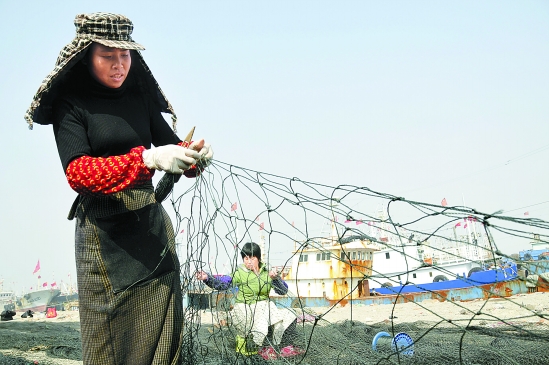 2月24日,台州椒江渔业码头一片繁忙景象,当地渔家女趁着晴好天气加紧修补渔具,为春汛捕捞生产做准备。