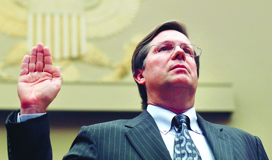 2月23日,在美国首都华盛顿,丰田汽车美国销售公司总裁兼首席运营官詹姆斯·伦茨在国会听证会上宣誓。詹姆斯·伦茨当天在美国国会作证时,就该公司对安全问题处理不当表示道歉,但坚持认为电子控制系统与丰田汽车的突然加速问题无关。