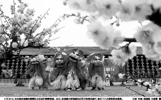 2月24日,长兴县林城镇的舞狮队正在进行舞狮表演。近日,林城镇万亩梅园的近百万株梅花盛开,吸引了八方游客前来观赏。 记者 钟昊 报道组 甘剑勇 摄
