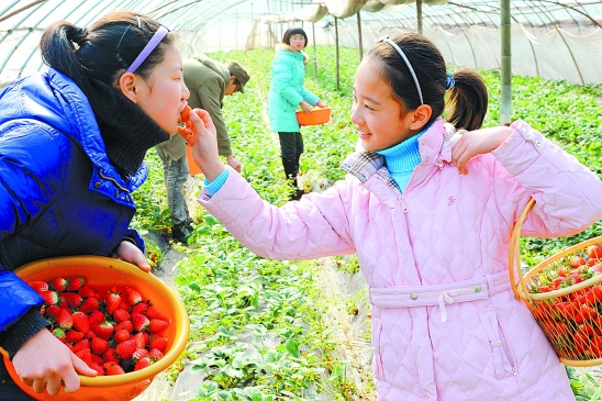 | 春天里,杭州的小伙伴们纷纷来到富阳市富春街道执中庭村的草莓大棚采摘草莓,既可品尝,又能体验采摘草莓的乐趣。离开时,她们还可以以每斤10元左右的价格购买带走,让她们好开心。眼下,每天来这里采摘草莓的城里人络绎不绝。 本报记者 叶寒青 摄 |