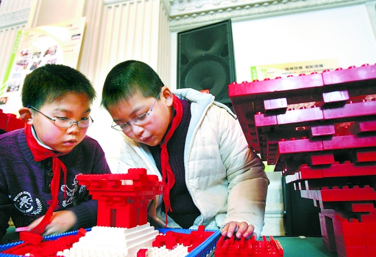 两名上海小学生在“搭建”上海世博会“中国馆”。