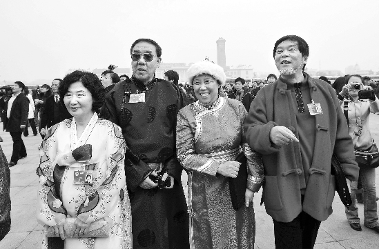 3月3日下午,全国政协十一届三次会议在北京隆重开幕。我省全国政协委员何水法(右)、鞠雅莲(蒙古族、右二)身着节日盛装,和其他几位少数民族委员一起兴高采烈地迈入人民大会堂。 吴海森 摄