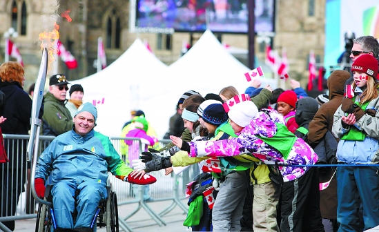3月3日,一名火炬手在传递活动中。当日,为期10天的2010年残疾人冬季奥运会火炬接力活动在渥太华加拿大国会山广场举行点火仪式,加拿大总理哈珀、残奥会官员以及多名加拿大优秀残疾人运动员参加。 新华社记者 张大成 摄