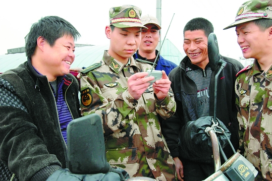 温州边防支队官兵深入田间地头,给农民送去收音机,以便他们生产劳作时能听到全国两会的声音。图为3月4日,官兵和菜农一起收听两会报道。吴水斌 摄