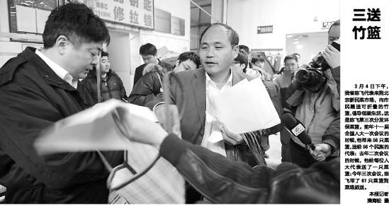3月4日下午,我省陈飞代表来到北京新民菜市场,向市民赠送可折叠的竹篮,倡导低碳生活。这是陈飞第三次分发环保菜篮。前年十一届全国人大一次会议的时候,他带来56只菜篮,送给56个民族的代表;去年二次会议的时候,他给每位人大代表送了一只菜篮;今年三次会议,陈飞带了61只菜篮到菜场派送。