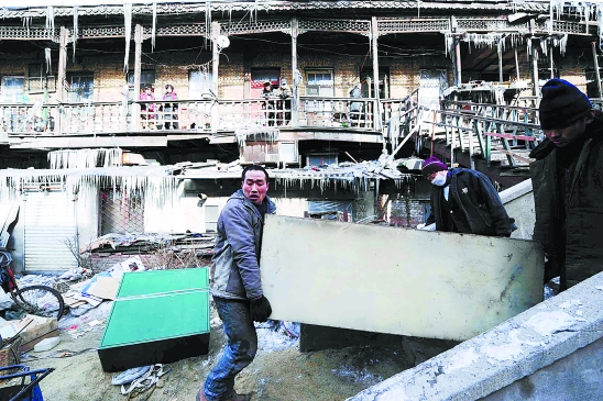 | 作为哈尔滨市2010年棚户区改造项目,哈尔滨“中华巴洛克”建筑保护更新项目二期工程拆迁工作于3月初启动。 “中华巴洛克”保护街区建筑群是我国中西合璧建筑群的典型代表。该项目位于哈尔滨市道外区南四道街、景阳街、南勋街、靖宇街围合区域,项目区内的大部分建筑因年久失修,老化破损严重。哈尔滨市计划对此区域进行保护性开发和改造,把这里开辟成商业旅游景点。图为3月3日,几位居民从楼上抬下一个柜子。新华社发 |