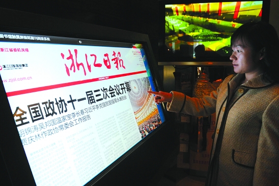 昨日,经济日报记者在政协委员驻地宾馆铁道大厦点击《浙江日报》的两会报道。这套“国家图书馆触摸屏报纸期刊阅读系统”,可以查阅全国200多家报纸。