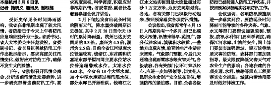 2月下旬起我省出现长时间的阴雨天气,降水量突破同期历史极值,其中2月28日至今天19时的累计降雨量,杭州已达历史同期的3.3倍,嘉兴为4.5倍,湖州为2.5倍。目前全省江河湖库水位普遍较高,钱塘江、东苕溪和杭嘉湖东部平原河网主要水位站水位普遍超警戒水位,太湖水位3.62米,全省有13个大型水库、30个中型水库超过梅汛限水位,部分水库已开始泄洪。钱塘江之江水文站实测到最大流量超过每秒1万立方米,为历史同期最高。各地、各有关部门已积极行动起来,按照预案落实各项防汛措施。