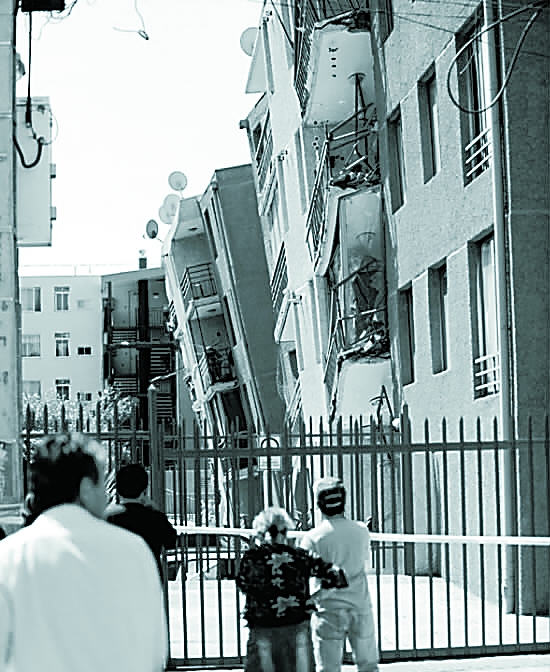 智利民众在观望地震中倾斜但尚未倒塌的楼房