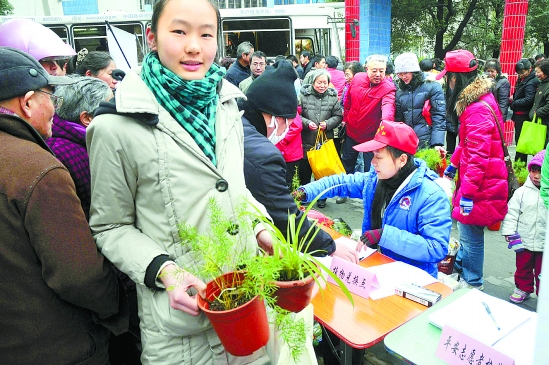 日前,在嘉兴明月公园和大润发广场,志愿者用废旧电池、报纸和塑料瓶换绿色植物,宣传低碳生活。