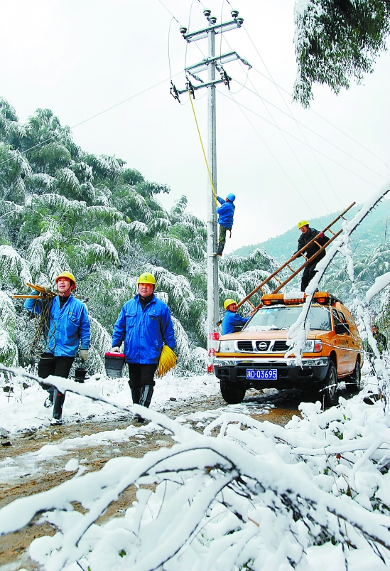 一夜大雪,使诸暨市东白湖区域的电力线路受到较大损坏,18个山区自然村停电。9日早7时,电力人员即实施抢修,到中午时全部恢复供电。诸暨日报记者 徐德文 蔡东森 摄