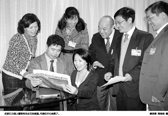 在浙江日报上看到有关自己的报道,代表们开心地笑了。 蔡荣章 周咏南 摄