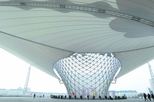 远看世博轴,就像静静的河水中徜徉着朵朵美丽的莲花。这种美丽浪漫的气质来自于世博轴刚柔并济的设计。