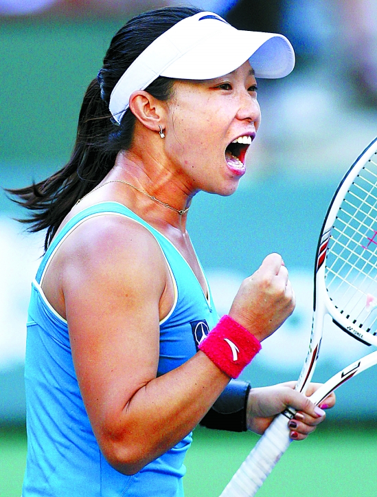 3月14日,中国选手郑洁庆祝胜利。当日,在印第安维尔斯网球赛女单比赛中,中国选手郑洁以2比1战胜俄罗斯名将莎拉波娃,晋级下一轮。 新华社发