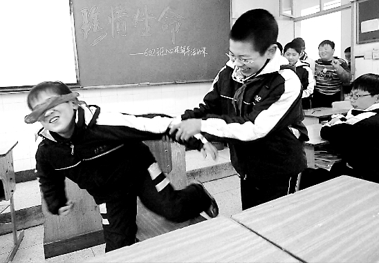 杭州大成实验学校六年级学生在做体验盲人生活的游戏。当日,该校以“珍惜生命”为主题举行班队活动课。 记者 叶寒青 摄