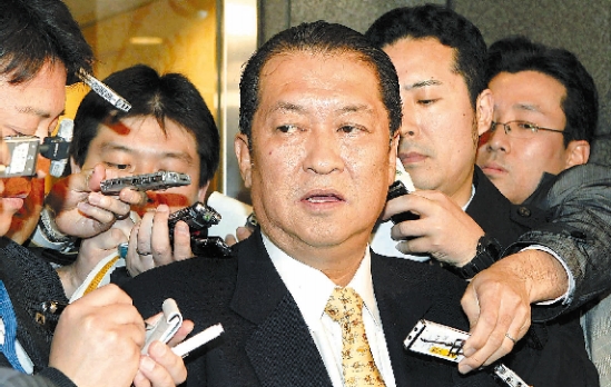 图为3月15日,鸠山邦夫(中)宣布退出日本自由民主党后离开办公室。 新华社发