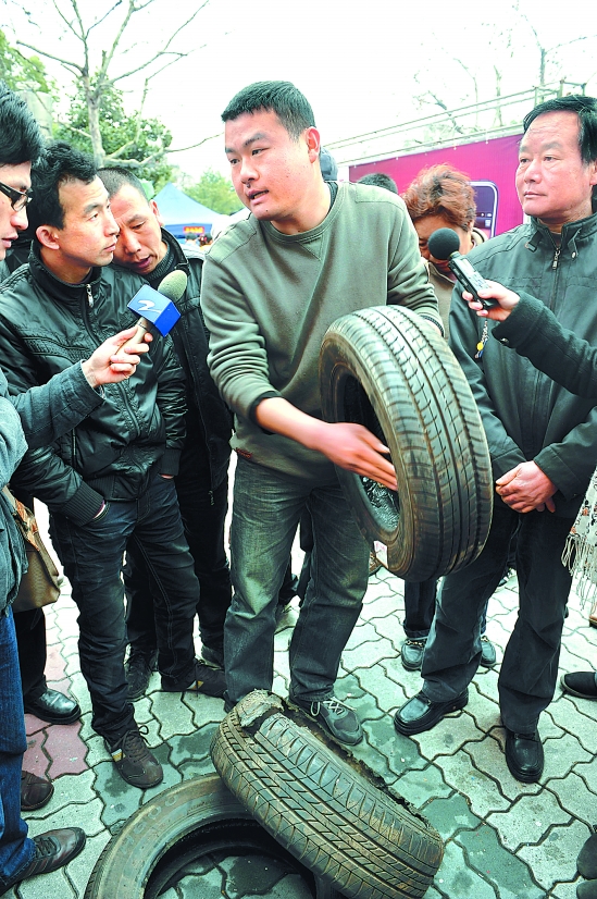 “3·15”大型宣传咨询服务活动在杭州吴山广场举行。图为一名年轻人在向媒体投诉轮胎质量问题。