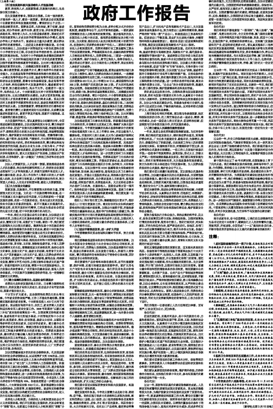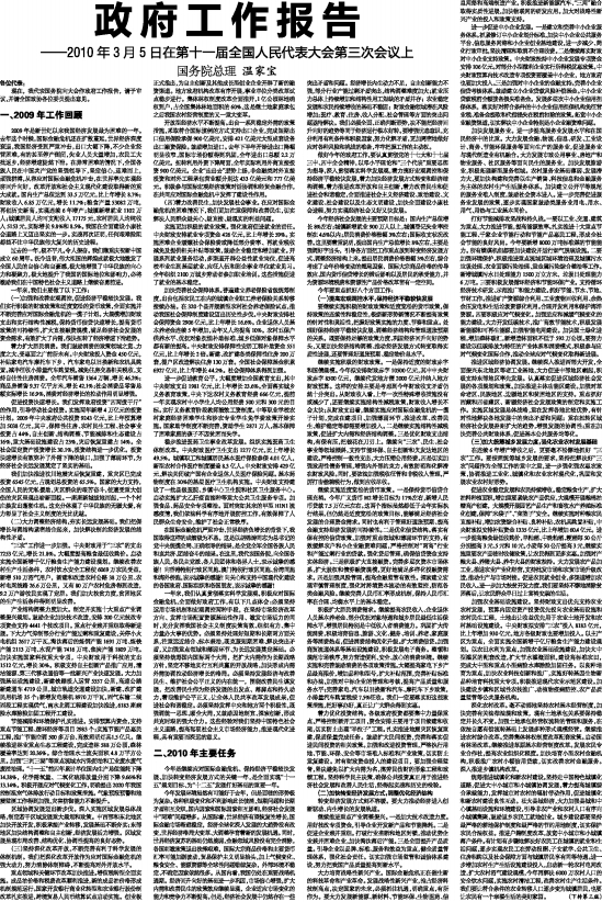 ——2010年3月5日在第十一届全国人民代表大会第三次会议上 国务院总理 温家宝