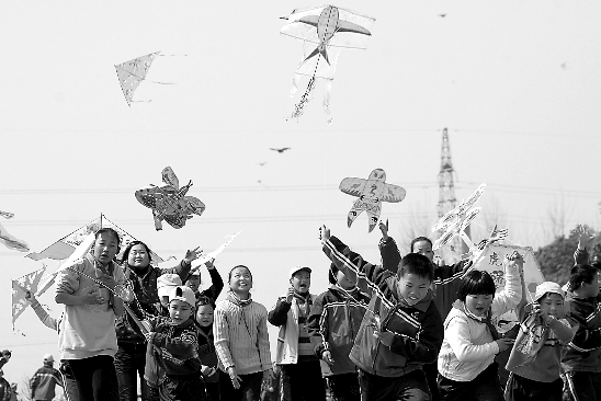3月17日,德清乾元镇中心小学1100多名少年儿童,制作了灰太狼、飞机、蝴蝶等形状的1000只风筝,放飞天空。