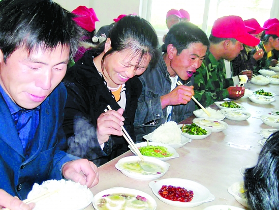 云南受灾民工到浙江后的第一餐。这次来“龙盛”的曲靖市会泽县农民工,有一大半从未出过远门,食堂工作人员特地为这些新同事准备了辣椒酱。 报道组 余彩龙 摄