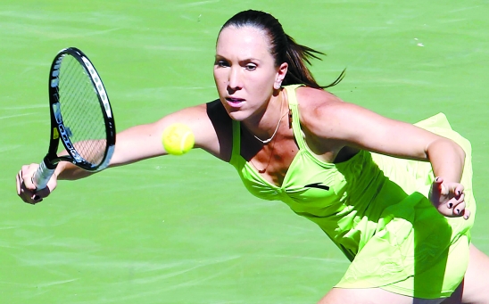 3月18日,塞尔维亚选手扬科维奇在比赛中回球。当日,在印第安韦尔斯网球赛女单四分之一决赛中,扬科维奇以2比0战胜俄罗斯选手克雷巴诺娃,晋级四强。 新华社发