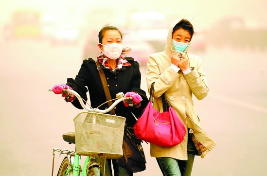 3月19日,两名行人冒着风沙走过内蒙古巴彦淖尔市临河区街头。当天,入春以来最强沙尘暴袭击北方6省区97个旗县,受影响土地面积约96万平方公里,受影响人口约1600万。