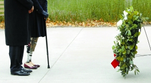 站立着的两双脚,不,一双是总统奥巴马的脚,另一双只是伊拉克战争老兵的假肢,他们向芝加哥军人公墓献花圈,两个人物,同样的举止,也许有不同的心情。这张新闻图片,画面简洁而又意味深长。两双脚的对比,将战争的残酷揭露无遗,截去画面上部人物的脸面,更增加读者的想象空间。一只花圈,已告诉人们所在的地方和要表达的内容。