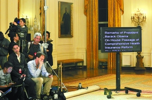 图为3月21日,在美国首都华盛顿白宫,记者等待美国总统奥巴马就国会众议院投票通过医疗改革法案发表讲话。 新华社发