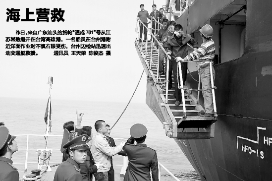 昨日,来自广东汕头的货轮“通成701”号从江苏常熟港开往台湾高雄港,一名船员在台州港附近洋面作业时不慎右眼受伤,台州边检站迅速出动交通艇救援。通讯员 王天荣 陈俊杰 摄