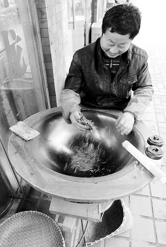 3月24日,在杭州副食品茶叶市场,店主正在炒制刚摘来的西湖龙井茶。由于遭到冰冻,明前的西湖龙井茶数量非常少,店主说:“每斤要卖5000元。”