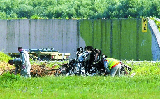 | 3月23日,英国空军“红箭”飞行表演队两架飞机在希腊克里特岛执行季前训练时相撞。其中一架飞机坠毁,飞行员用降落伞着陆,头部和肩部受伤;另一架飞机安全降落,飞行员安然无恙。这是“红箭”飞行表演队近40年来首次发生飞机相撞事件。英国国防部已着手调查事件起因。图为救援专家检查坠毁飞机的残骸。新华社发 |