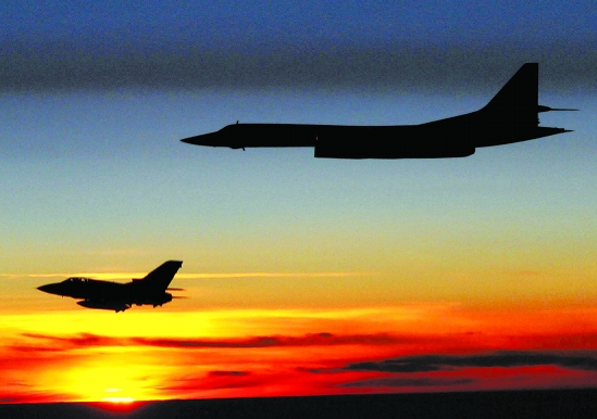 这张英国国防部3月24日发布的照片显示,一架俄罗斯图-160重型轰炸机(上)在北爱尔兰沿海上空遇到英国皇家空军的“旋风-F3”战斗机(下)拦截。 新华社发