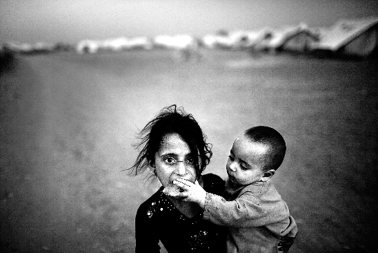 ↑ 2009年3月20日,巴基斯坦斯瓦比的难民营中,巴基斯坦军队与塔利班交战后流离失所的小女孩。她的弟弟正将一块冰放入她的口中。巴基斯坦军对塔利班的军事行动使超过3百万人流离失所。国内已有超过15万人从斯瓦特、布内尔、下迪尔逃离,度过数月严酷的难民营生活。 (澳)丹尼尔·贝雷胡拉克 摄