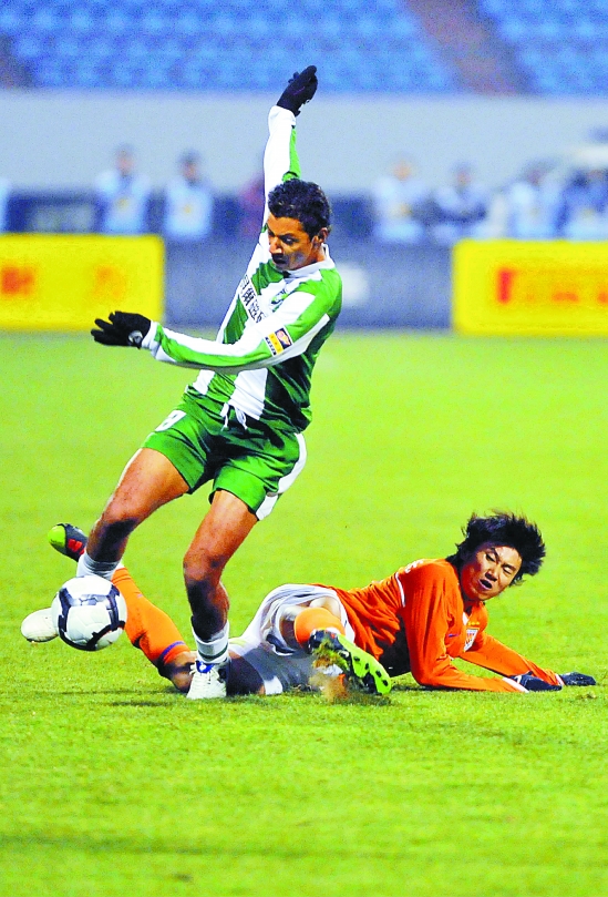 3月27日,杭州绿城队球员萨比伦(上)带球突破。当日,山东鲁能队在2010年中超联赛首轮比赛中,主场以4比2战胜杭州绿城队。