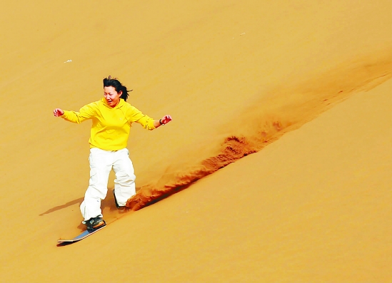 阳春3月,在滑雪场陆续关门歇业后,单板滑沙渐兴潮流。年轻人从天山脚下走到了距离城市最近的沙漠——新疆鄯善县城边的库木塔格沙漠,从超过45度的沙丘上脚踩单板疾驰而下。新华社发