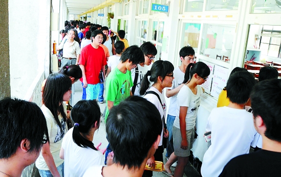 2009年台湾地区“高考”的热闹场景。考生在考场内挥汗苦“考”,考场外众多家长焦急陪“烤”,真是两岸同此一“景”。
