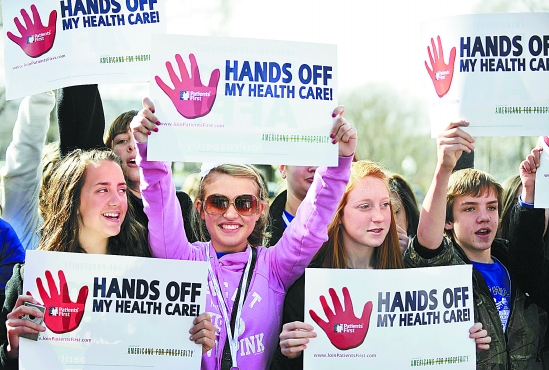 抗议者在华盛顿国会山前举着标语,要求国会不要通过医疗改革法案。