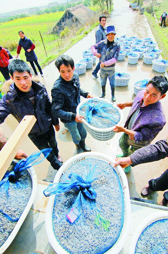 | 右图:3月28日,记者来到三门县浬浦镇草头村,看到村民们正在把称好的一箩筐一箩筐蛏苗搬上车,准备销往县内各养殖塘及江苏、山东等地。村民们告诉记者,今年蛏苗产量和销售形势喜人,全县共有4万亩蛏苗养殖滩涂,亩产量达到150公斤,收入将超过1000万元。 记者 叶晖 通讯员 陈兴长 摄 |